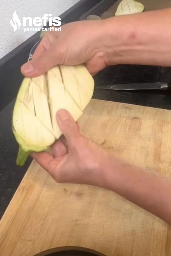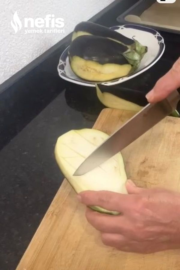 - Patlıcanları alacalı soyun ve sap kısımlarını alın. Ortadan ikiye bölün.