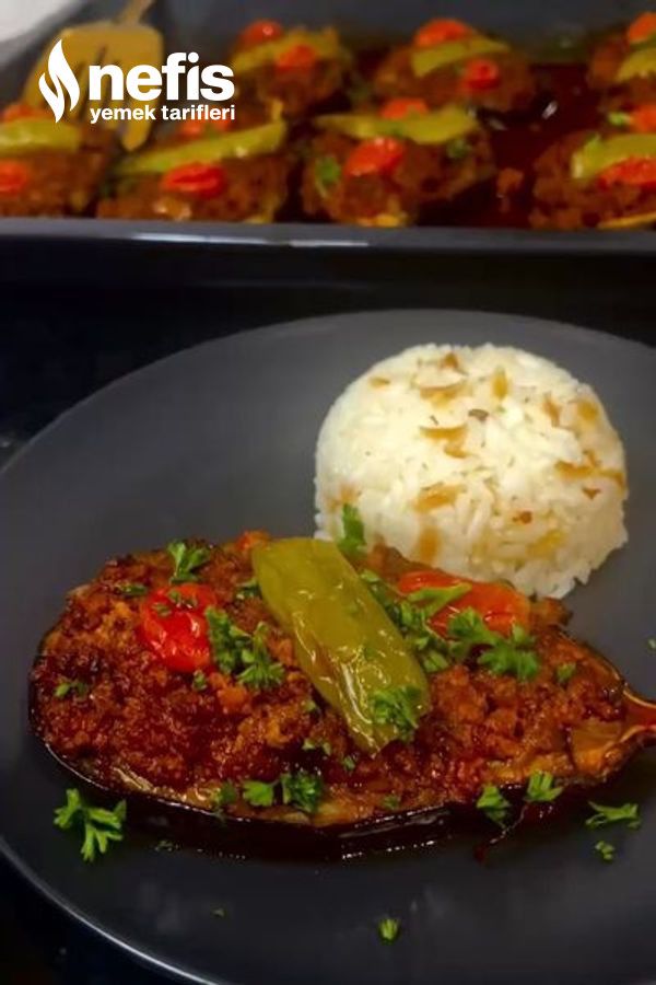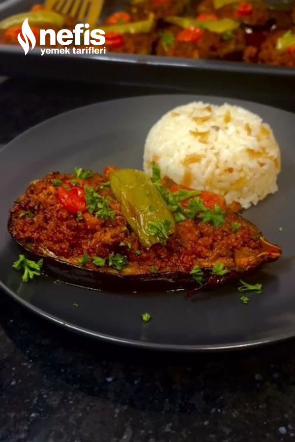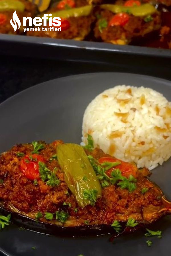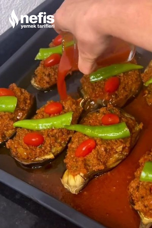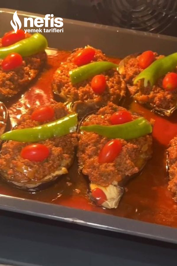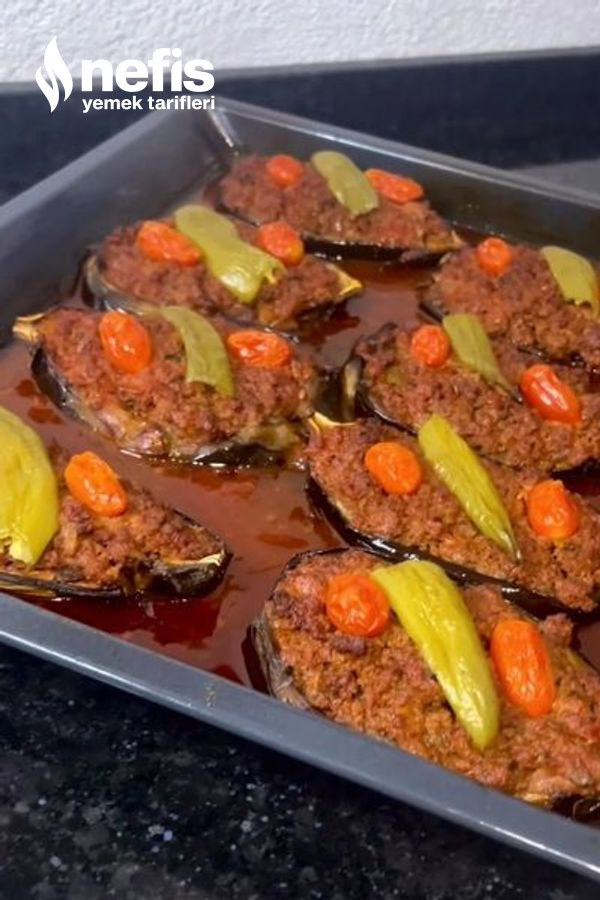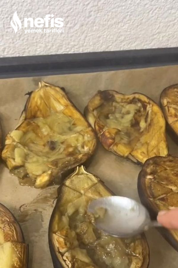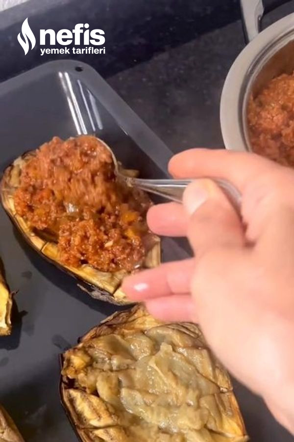 - Kızaran patlıcanların ortasını bir kaşık yardımıyla açın ve içlerine kıymalı harcı doldurun.