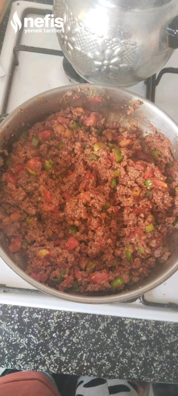 - Kıymada ek edilerek pişirilir ve akabinde doğranan domatesler, su, salça, baharatlar da koyularak pişmeye bırakılır.
