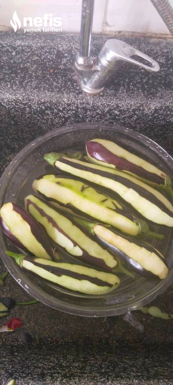 - Fırın tepsiye ölçüsüz soyulan patlıcanlar dizilir ve akabinde yumurta fırçası ile her yeri yağlanır.