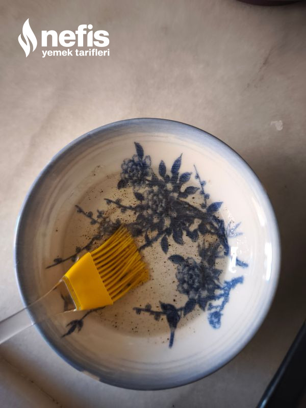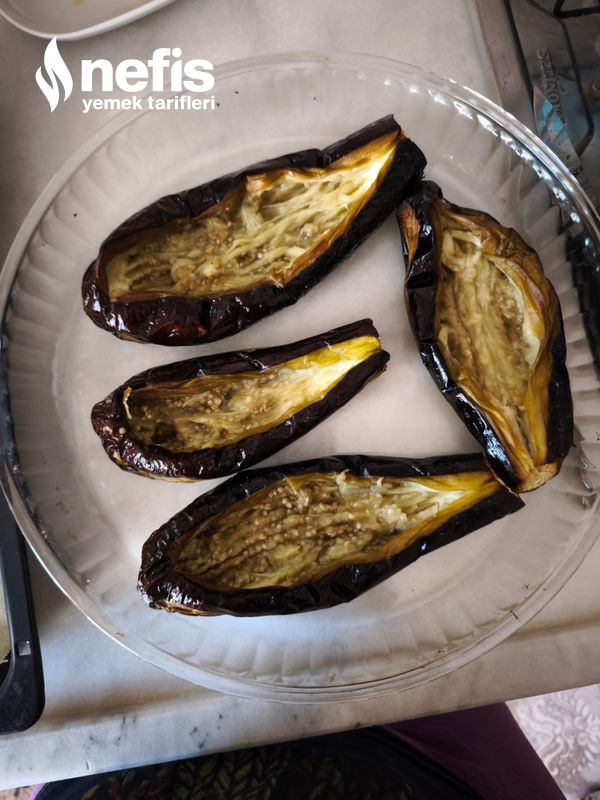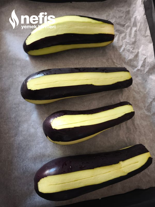 1. Patlıcanların ortasına çizik atıp, yağ ve karabiberle sosladıktan sonra yağlı kağıt serili tepsiye alalım.