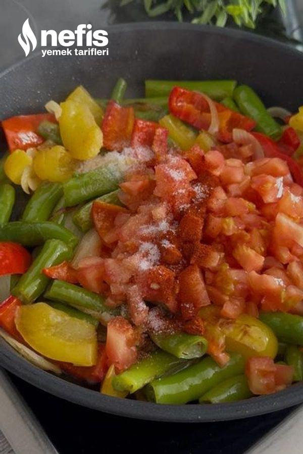 - Soğan ve biberleri sıvı yağda kavuralım. Akabinde kabuğu soyulmuş domatesleri tuz ve baharatları ekleyip karıştıralım.