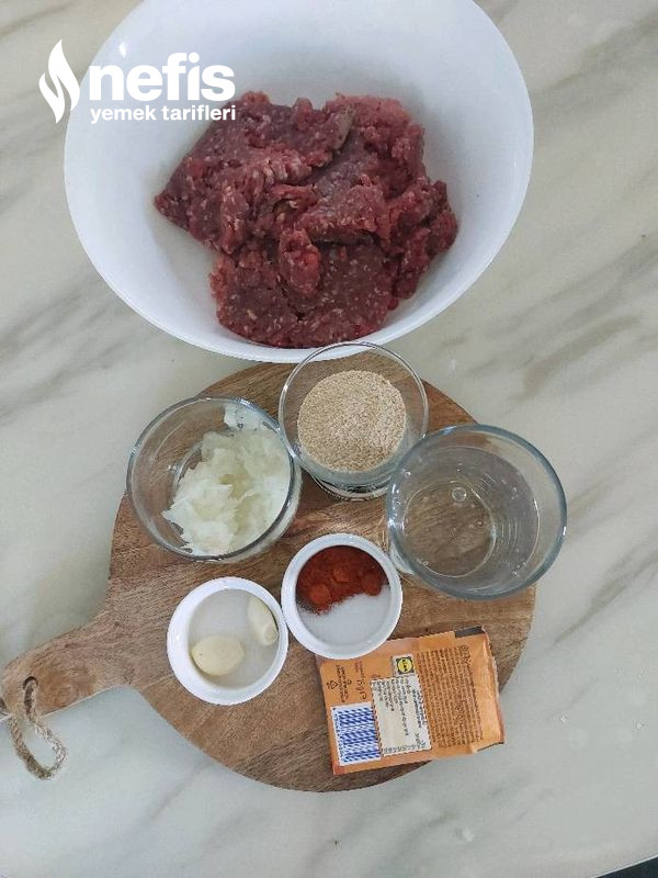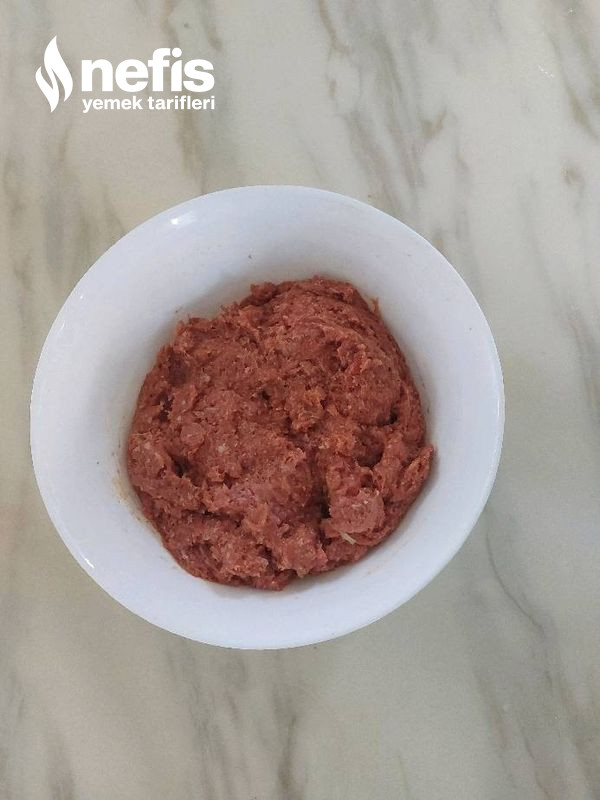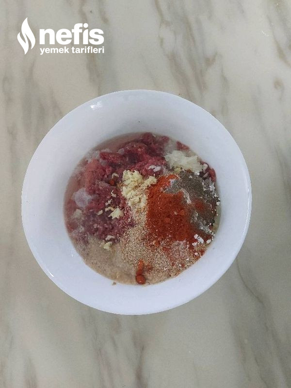 - Uygun bir kabın içine kıymayı, kuyruk yağını soğanı, sarımsakları, baharatları ,maden suyunu, galeta ununu ve kabartma tozunu ekleyip güzelce yoğurunuz.