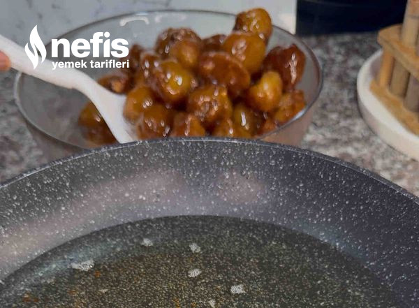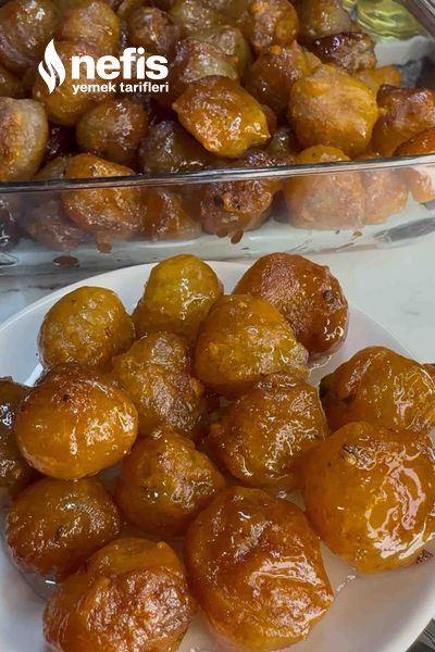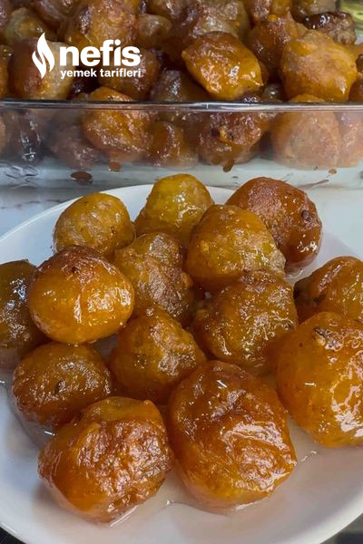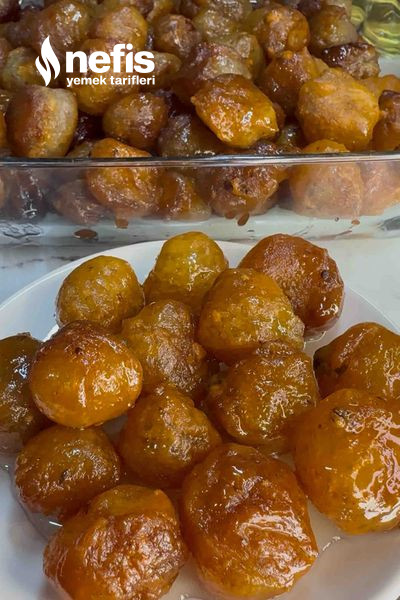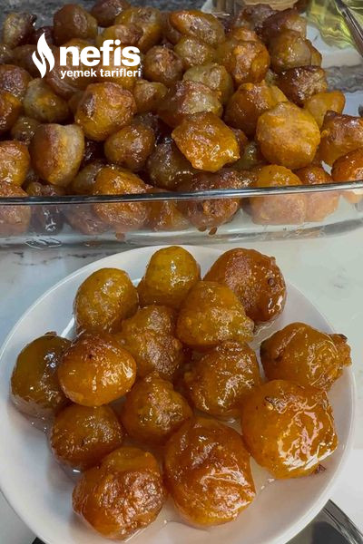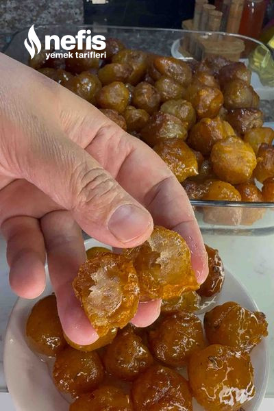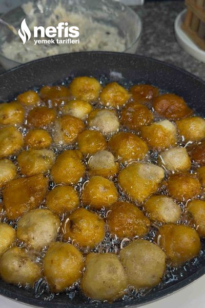 4. Kızaran tatlıları yağdan çıkarıp, soğuk şerbetin içine atın yağda kızaran tatlıları çıkarmaya yakın şerbetin içindeki tatlıları tabağa alın ve öteki kızaran tatlıları şerbete atın. Hamur bitene kadar bu biçimde devam edin.
