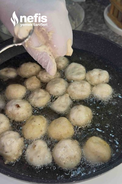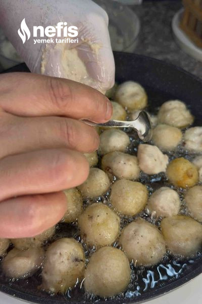 3. Hazırlanan hamura iri çekilmiş cevizleri de ekleyip, karıştırın. Sıvıyağı tavaya döküp, ısıtın çay kaşığıyla hamurdan kesimler alıp yağın içine atın. Pembeleşince karıştırarak her tarafını kızartın.