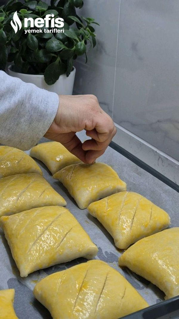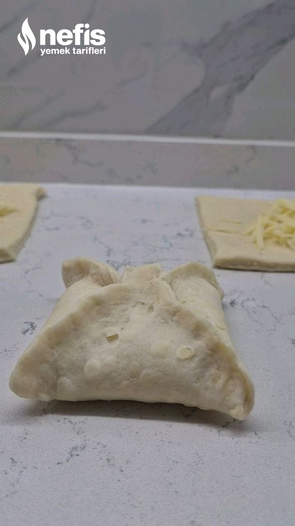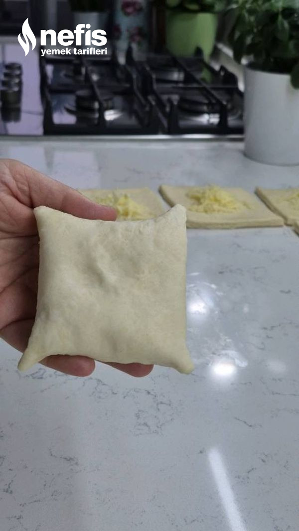 - 16 eşit (12×12cm) modüle bölün içlerine kaşar peynirini koyup altını zarf biçiminde kapatın.