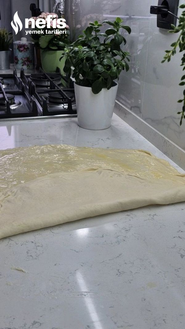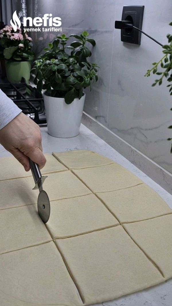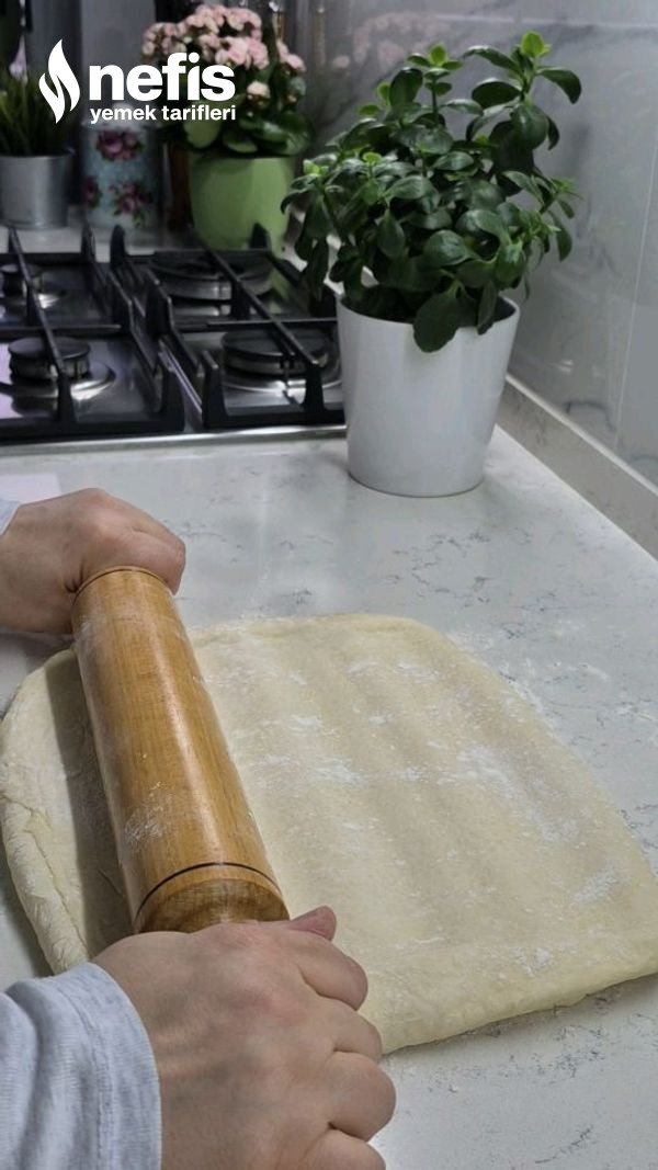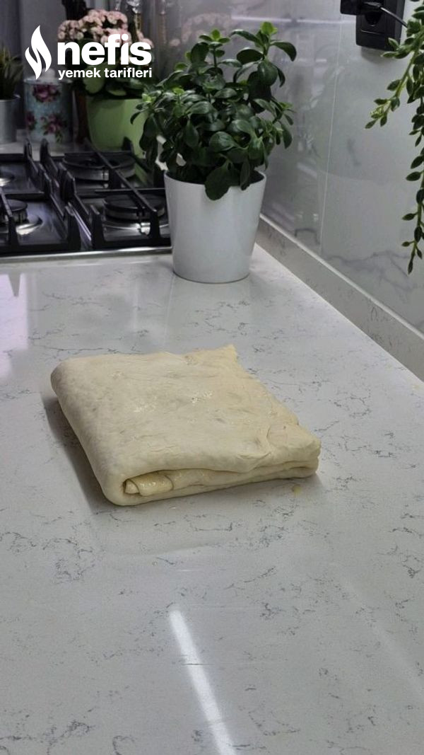 - Buzluktan çıkan hamuru un yardımıyla kare halde açın 48 x48cm uzunluğunda olsun.