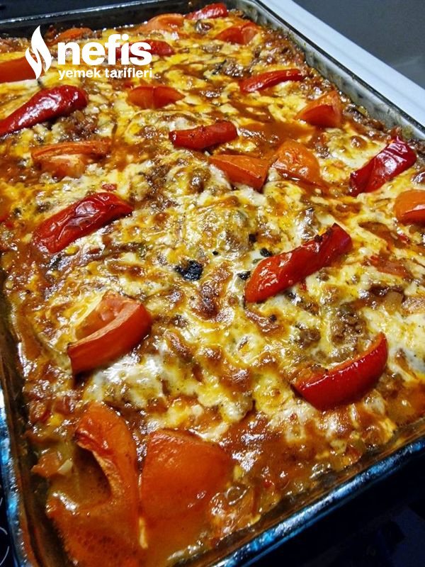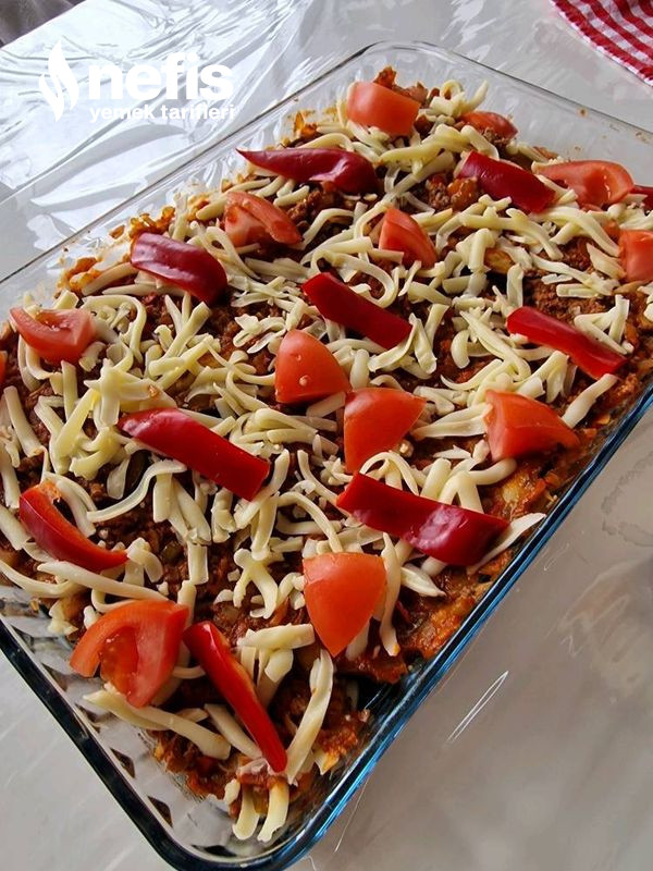 - En üstüne kıymalı harcımızdan ve kaşar peyniri yerleştirelim üzerini domateslerle süsleyelim.