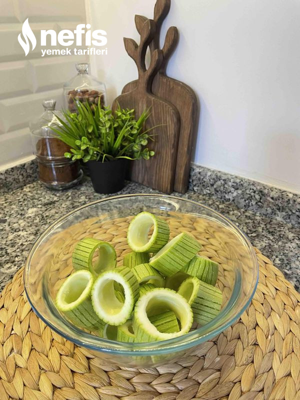 1. Kabaklara çatalla çizik atıp, kalın halka biçiminde doğrayalım. (görsellere ekledim)kabak içlerini alalım.