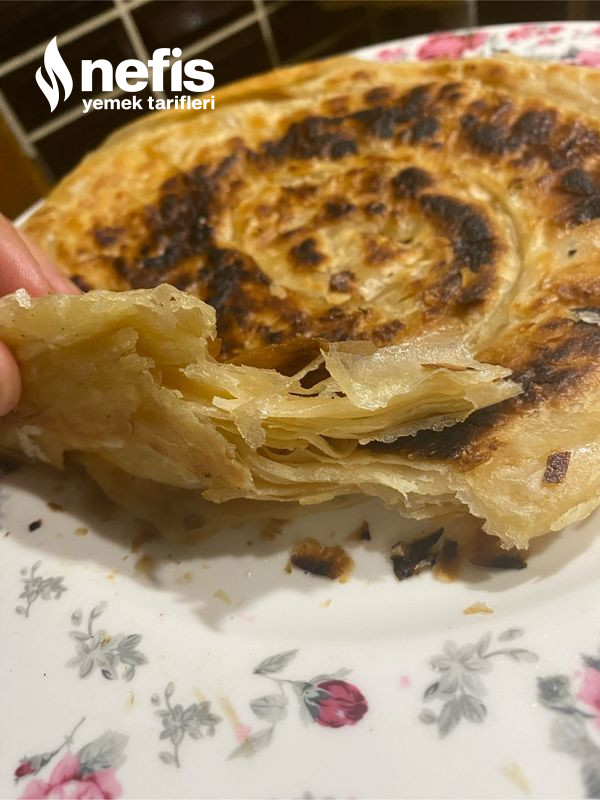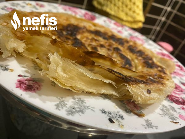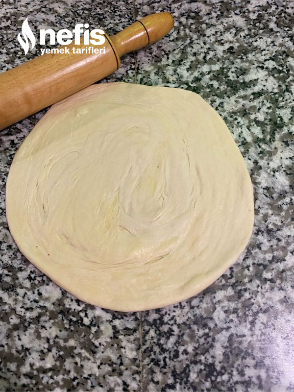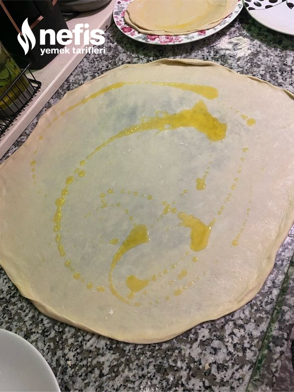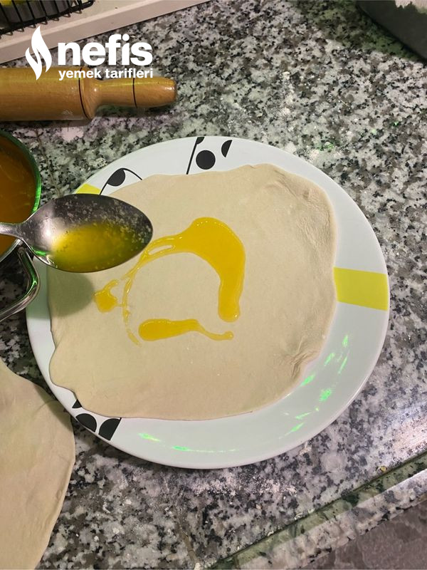6. Teker teker hamuru merdane yardımıyla açalım. Açtığımız hamuru bir tabağa alalım erittiğimiz tereyağından 2 -3 kaşık hamura sürelim tekrardan açtığımız hamuru üzerine alıp onunda üzerine yağdan dökelim.