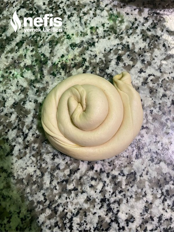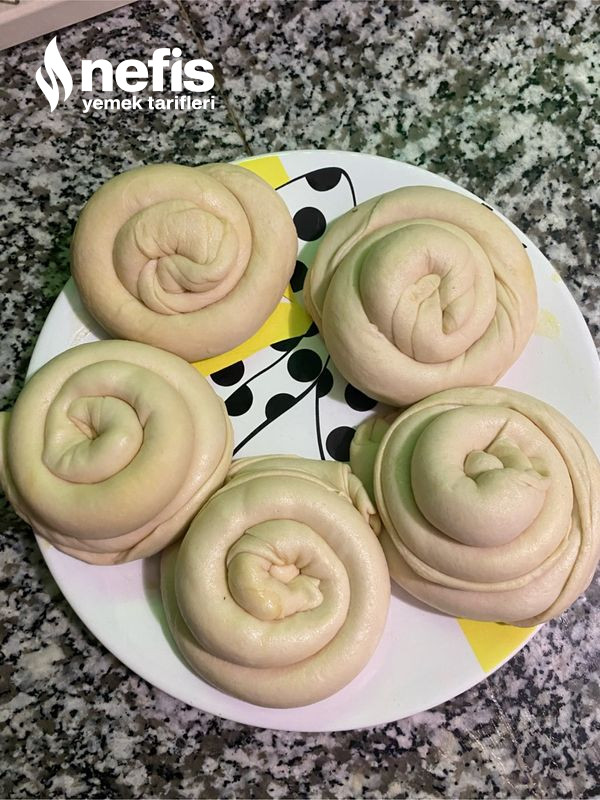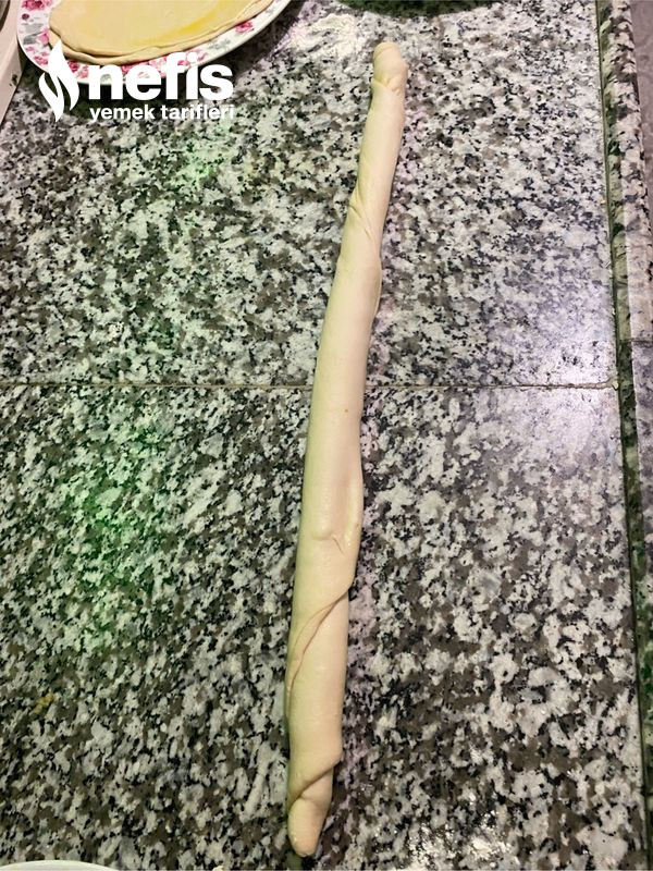 8. Dinlenen 2 şer tane hamuru elimizle yavaşça çekiştirerek inceltelim ve açtığımız hamurun üzerine tekrardan 2 kaşık tereyağdan sürüp rulo biçimde sarıp gül böreği formu verelim ve üstünü örtüp buzdolabında 1 saat bekletelim. Buzdolabından çıkarttıktan sonra merdaneyle ne ince ne kalın olacak biçimde biraz büyütelim.