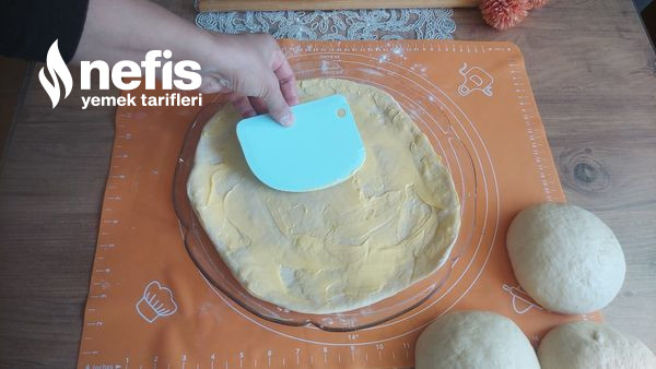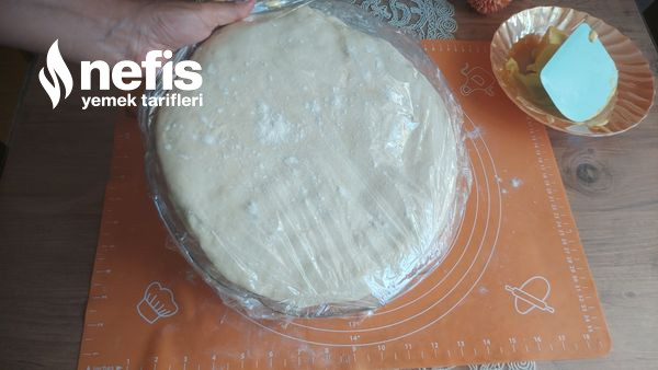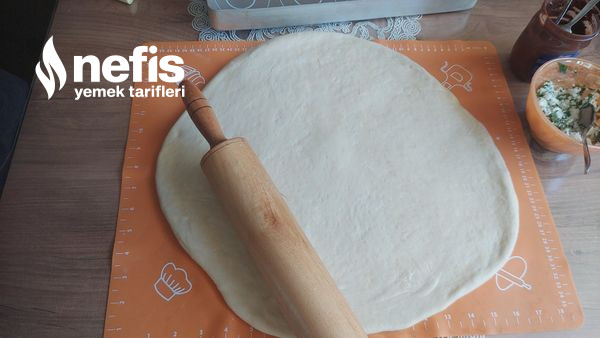 - Sonrasında buzdolabından alıp merdane ile nazikçe bastırarak yuvarlak büyük uzunluk yuvarlak fırın tepsisi boyutunda açalım .