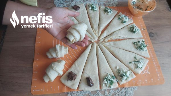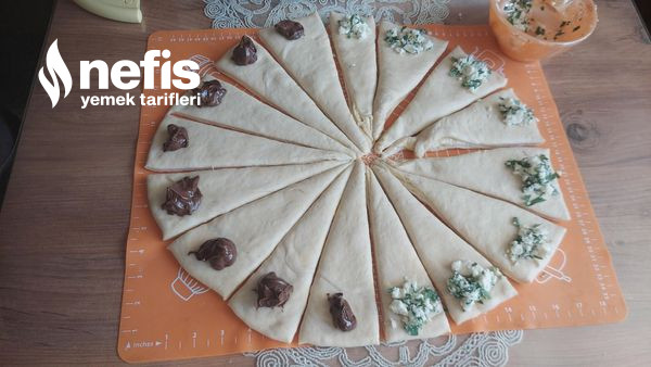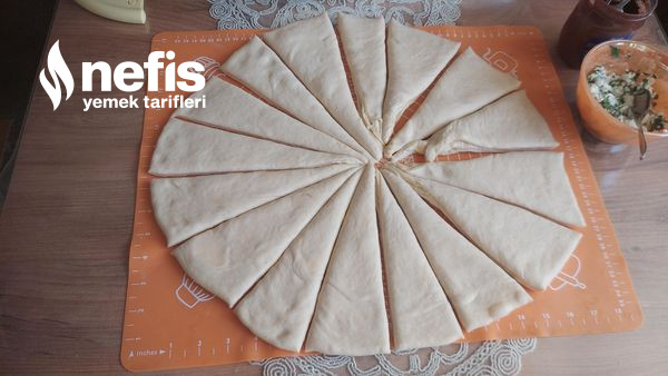 - Açtığımız hamuru görüntüdeki üzere üçgen olacak formda 16 eşit modüle bölelim kesimlerin ucuna yarısına peynir yarısına sürülebilir.