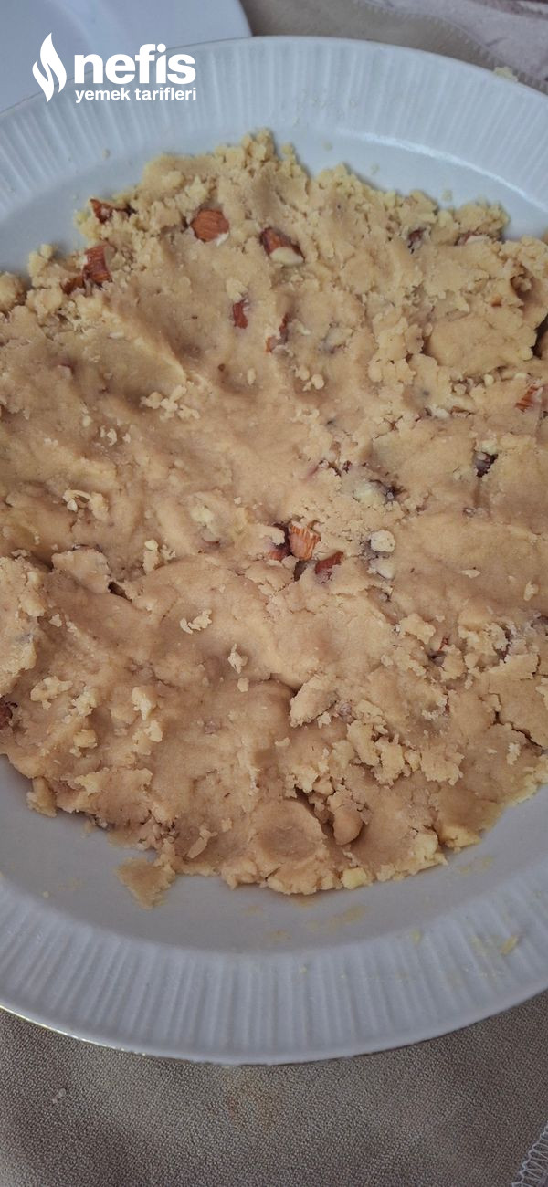 2. Daha sonra uygun bir kaba öteki materyalleri ekleyip biraz yoğuruyoruz daha sonra kavurduğumuz un ve bademi ekleyip birkaç dakika yoğuruyoruz çay bardağı ile hal verip yağlı kağıt serili tepsiye alıyoruz.