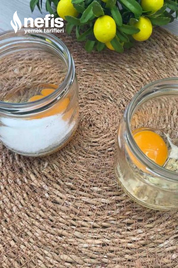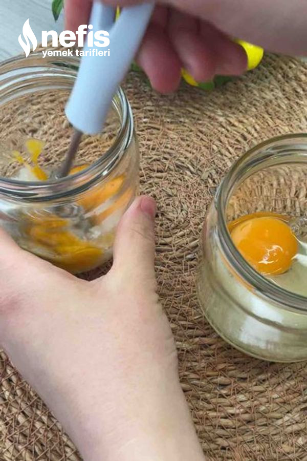 1. Kavanozlarımın içine birer yumurta ve iki yemek kaşığı toz şekeri koyup çırptım.