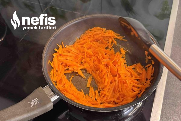 - Rendelenmiş iri havuçları sıvı yağında kavurun ve soğumaya bırakın.