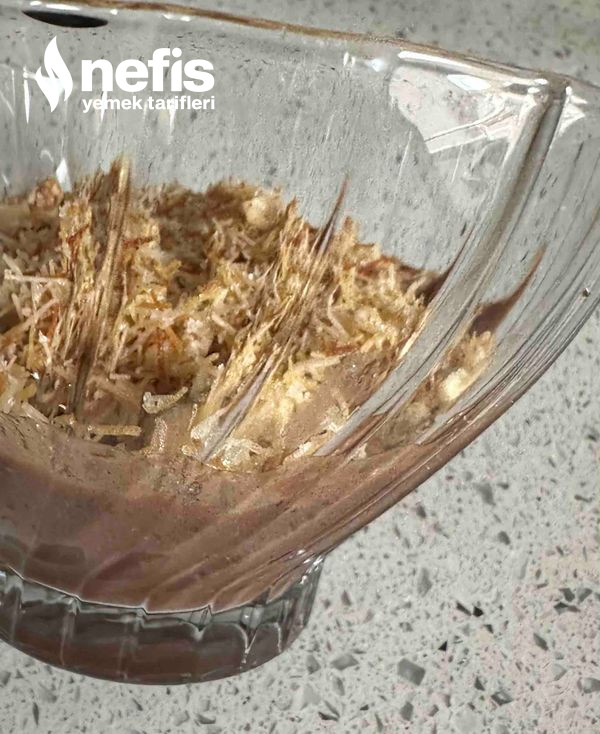 4. Kabın en altına kakaolu karışımı ortaya kavrulmuş kadayıf üstüne beyaz olan kısmını döküp dolaba soğuması için kaldıralım.