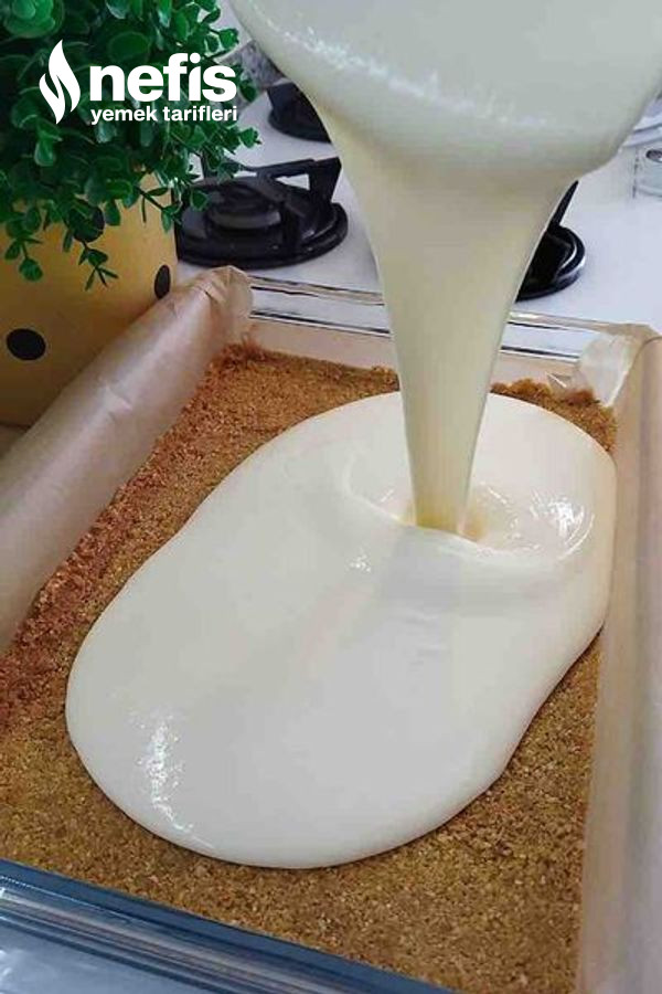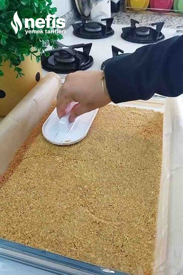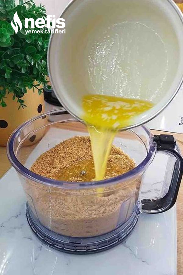 - Tabanı için bisküvileri ve fındığı rondodan çekin, üzerine eritilmiş tereyağı ekleyip karıştırın, sonra tabanına yağlı kağıt serilmiş dikdörtgen borcama aktarıp bastırın.