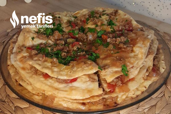 - Lavaşların kenarlarını yaptığınız harca bandırın akabinde tabağa açın ve üzerine kıymalı harçtan koyarak yayın.