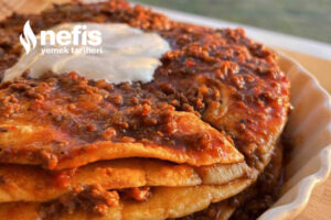 - Her lavaşın üzerine kıymalı harçtan sürerek üst üste dizin.