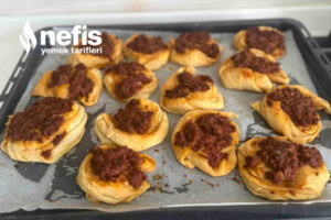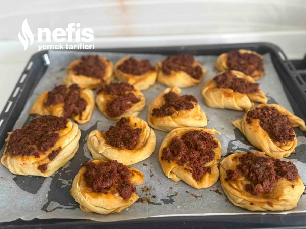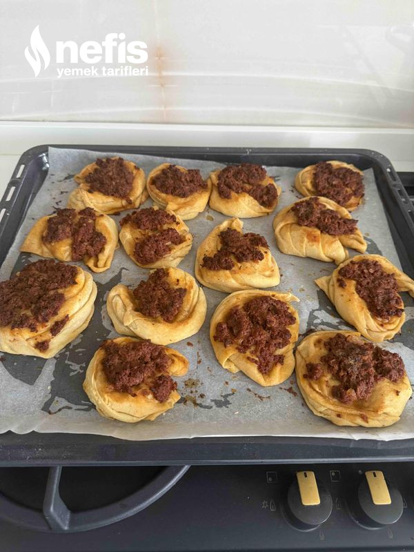 - Gül formunda koyduğumuz hamurların üstüne kıyma harcını ekleyip üzerine fırça ile tereyağ sürüp, evvelce ısıtılmış fırında 35 dk 180 derecede pişirelim.