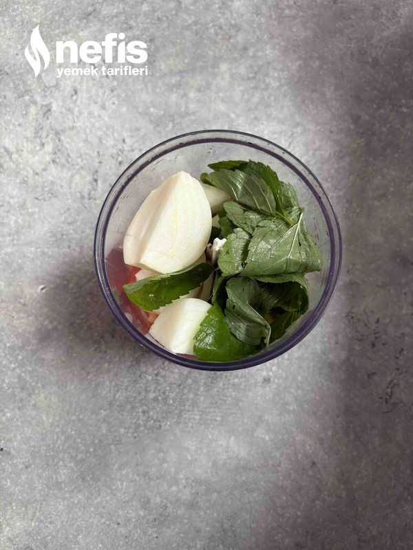 1. Öncelikle domatesleri bir kaç kesime ayırınız. Sonra soğanı fazla küçültmeden doğrayınız kapya ve yeşil biberlerin çekirdeklerini çıkarıp kesimlere ayırınız sarımsakları, taze nane kullanırsanız onunda yaprakları ayırınız hepsini robottan geçiriniz. Robotunuz yoksa elinizde ince ince doğrayınız.