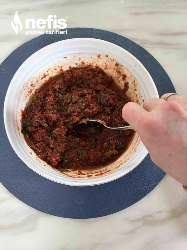 3. Karıştırma kabınızın içine robottan geçirmiş olduğunuz zerzevatları zeytin yağını, limon suyunu nar ekşisini salçaları, baharatları ve maydanozları ekleyip, hepsini karıştırınız ezmeniz hazırdır.