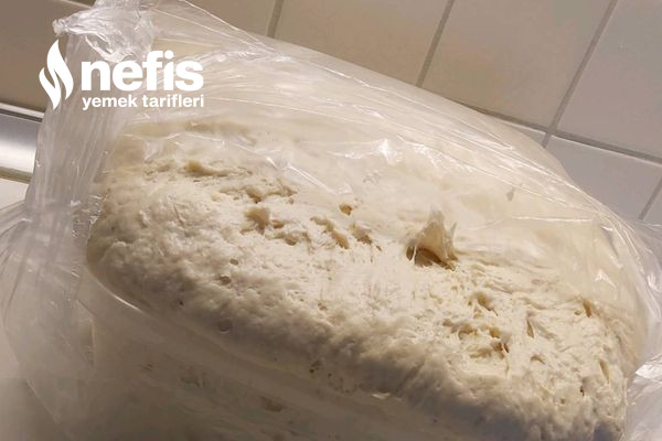 4. Bir poşete geçirip 45 dakika kadar sıcak bir ortamda kabarmasını bekleyin, kabarınca hamuru tekrar elinizi yağlayıp toparlayın .