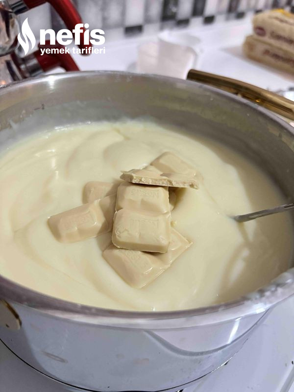 - Kaynayan kremanın altını kapatıp tereyağ, vanilya ve beyaz çikolatayı ekleyelim eriyene kadar karıştıralım.