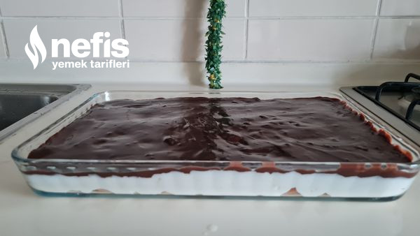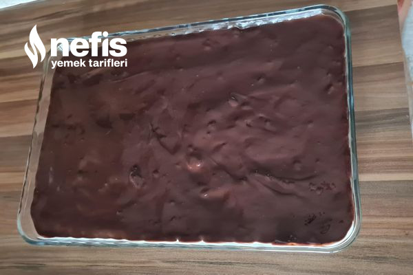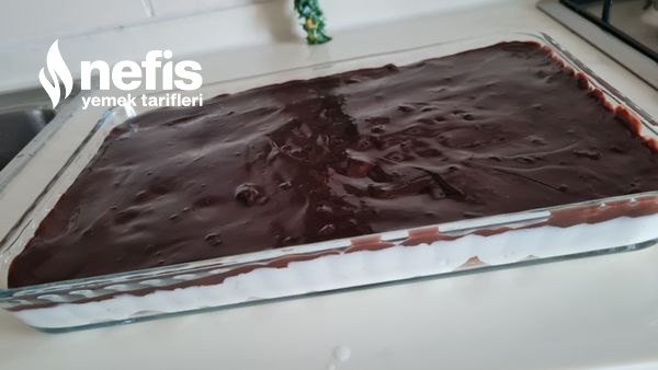 - Bi tencerede çikolata sosunu pişirip hafif ılıdıktan sonra kremanın üstüne döküyoruz, tatlı soğuduktan sonra dolaba koyuyoruz en az 4 saat dolapta dinlendiriyoruz.