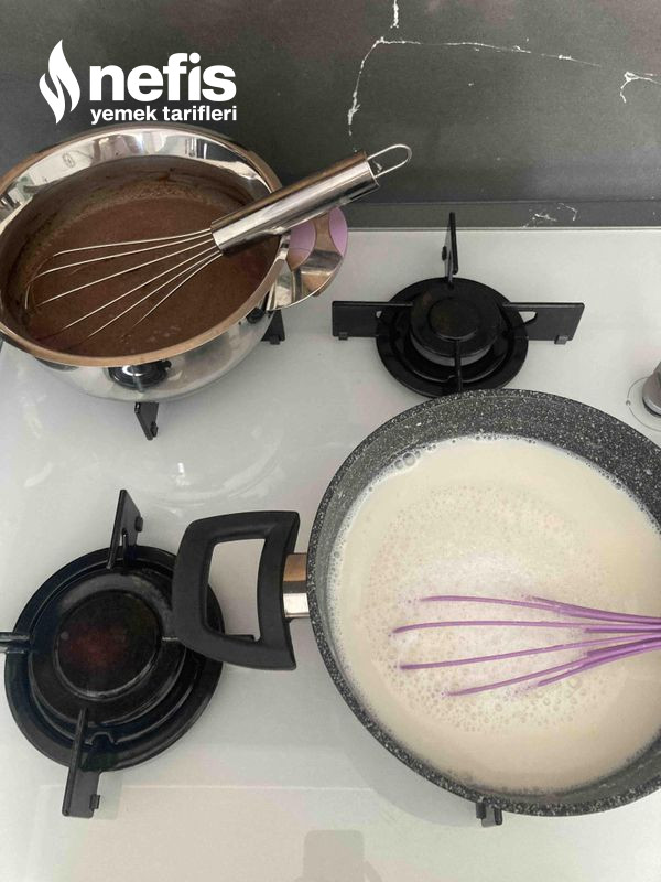 - Sütü, toz şekeri,nişasta ve unu bir tencereye alıp kısıl ateşte daima karıştırarak pişirin.