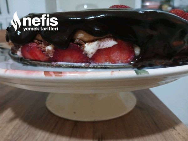 7. Soğuyan çikolata sosumuzu üzerine döküp her yere yayıyoruz en son ben üzerine tekrar çilek ilave ettim. 1 saat dinlendikten sonra kalıptan çıkarıp sunuma alabilirsiniz. Afiyet olsun.