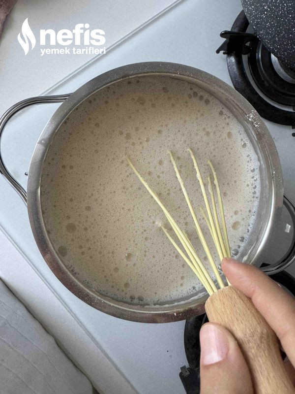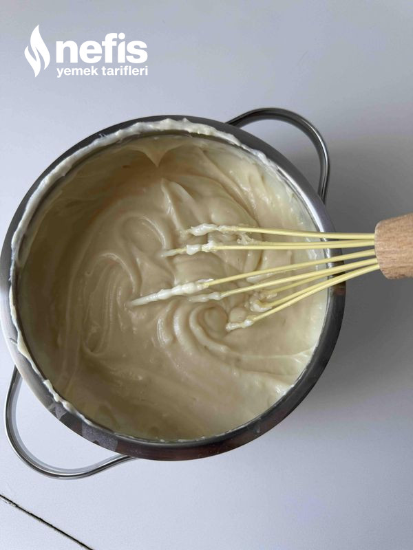 - Kıvam aldıktan sonra kapatıp vanilyayı ekleyelim, ılık olunca labne peyniri ekleyip pürüzsüz kıvam alıncaya kadar karıştırmaya devam edelim.