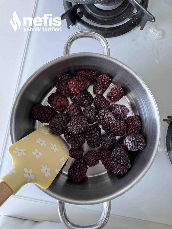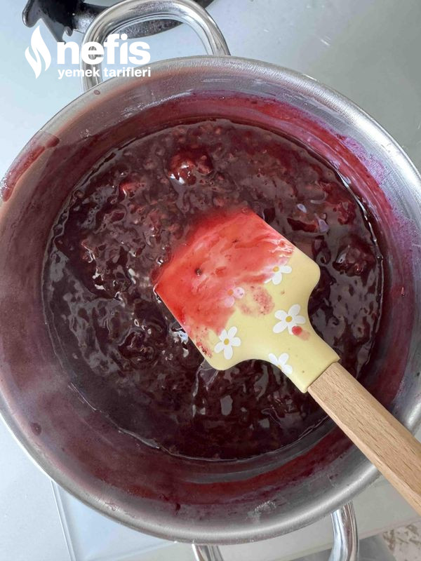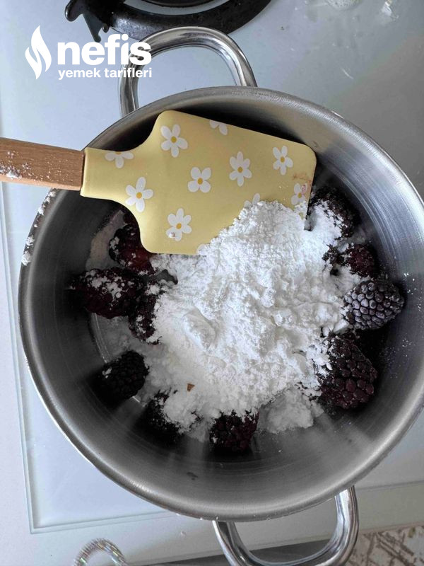 - Sonra nişastayı açıp böğürtlenin içine ekleyelim kıvam alınca altını kapatıp kenara alalım soğuması için.