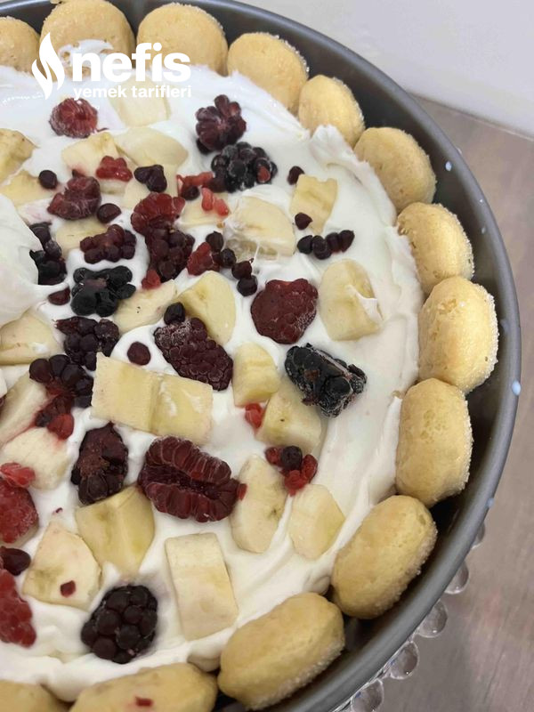 7. Meyvelerin üstüne tekrar kedidillerini ıslatıp dizelim ve tekrar krema dökelim. İstediğimiz meyvelerden koyalım.