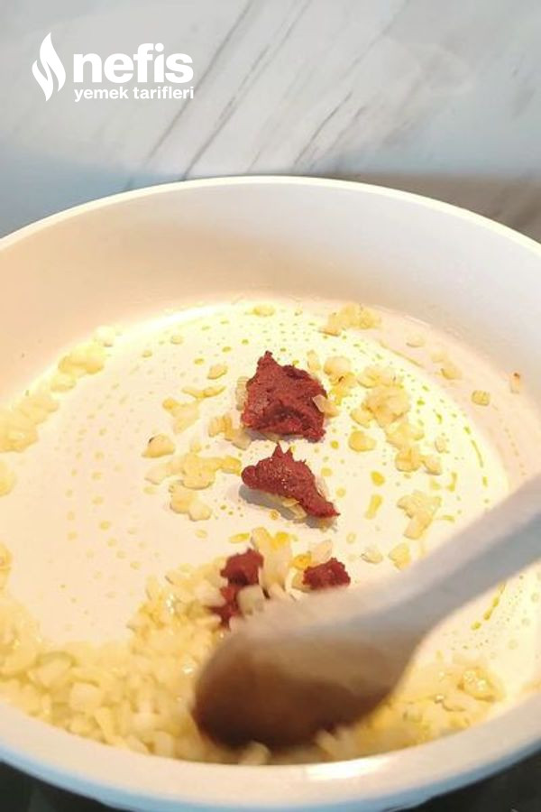 5. Salçayı ekleyip, az bi kaynar su ile açıyoruz.