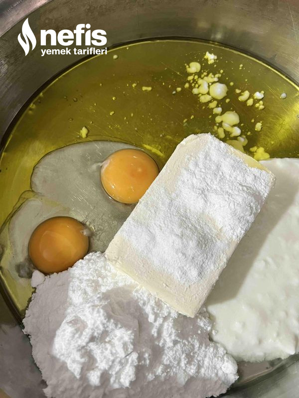 - Margarin, yumurta, sıvı yağı, yoğurt, pudra şekeri, vanilya, kabartma tozunu alıp karıştıralım üzerine de unu eleyip karıştıralım 1 saat dinlendirelim.
