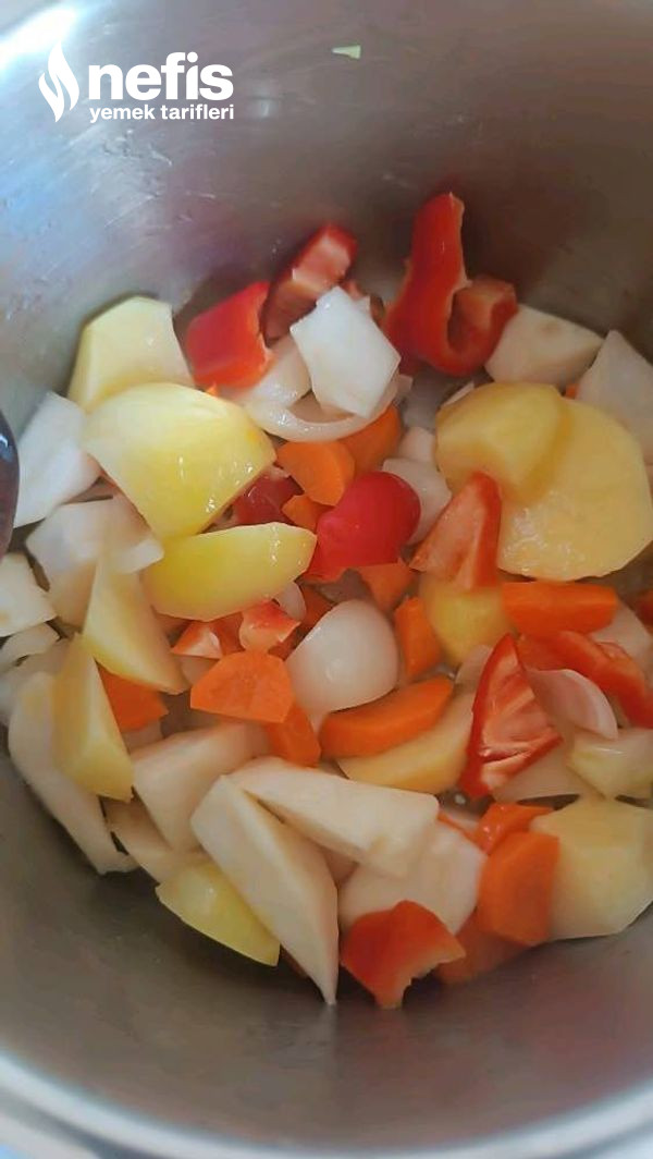 1. Sebzeler doğranır yağ ve un ile birlikte kavrulduktan sonra üzerine suyu ve et suyu eklenir baharatlar eklenerek pişirilir.