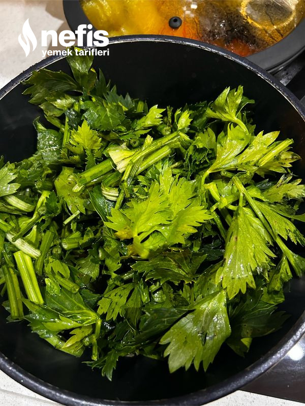 - 1 yada 2 adet kerevizin yapraklarını ve saplarından sağlam olanları ayıralım çok uç kısımlarını almadan genelde orta kısımları doğrayalım sap oranı yaprağa nazaran daha fazla olsun.