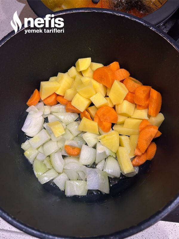 - Rengi döndükten sonra patates ve havucu atıp biraz daha kavuralım.