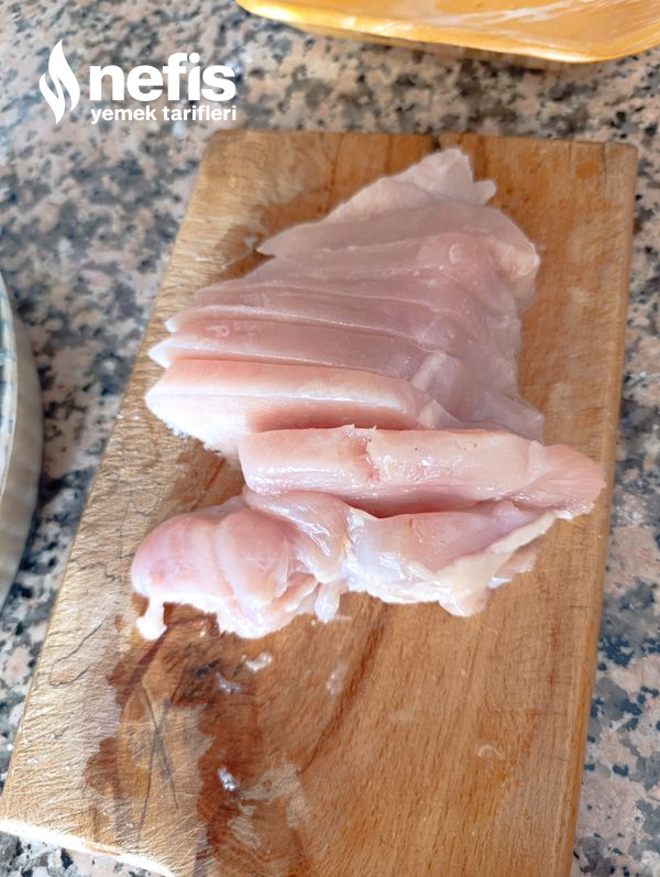 - Çıtır tavukları yapmaya başlamak için birinci olarak tavuk filetoları bir parmak kalınlığında uzunlamasına kesiyoruz.
