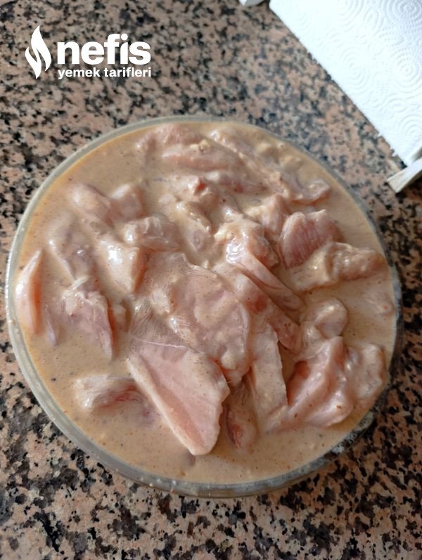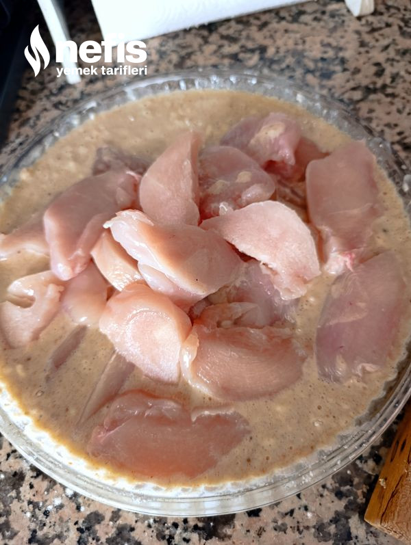 - Daha sonra süt, sıvı yağ, yumurta, tuz, soda un ve baharatları ek edip karıştırıyoruz tavuklarımızı bu harcın içine koyup güzelce karıştırıyoruz üzerini streç yahut bir kapak ile kapatıp buzdolabına alıyoruz en az 2 saat beklemesi gerekiyor.