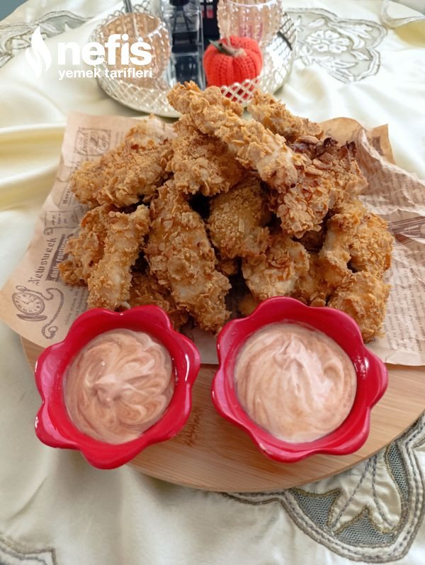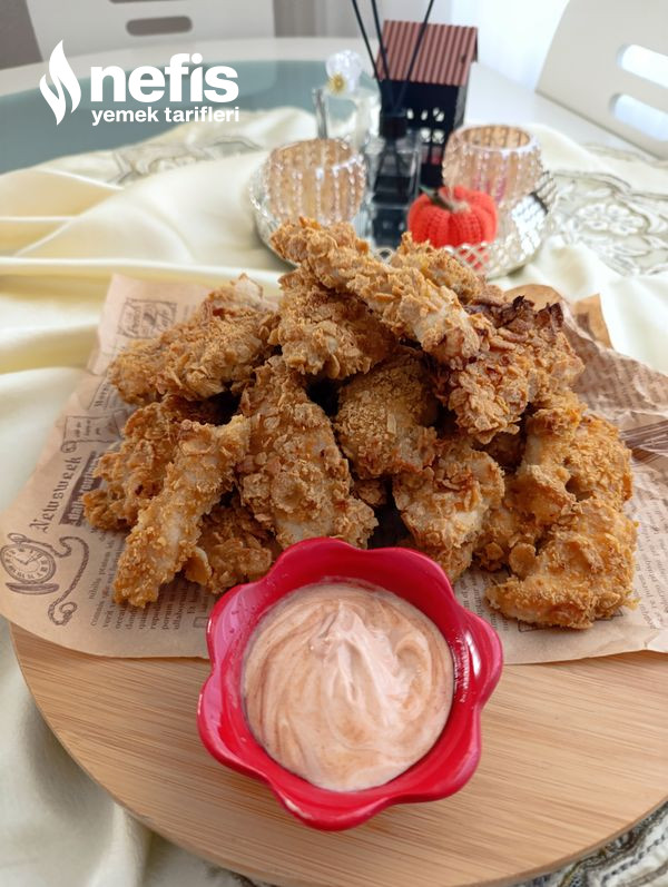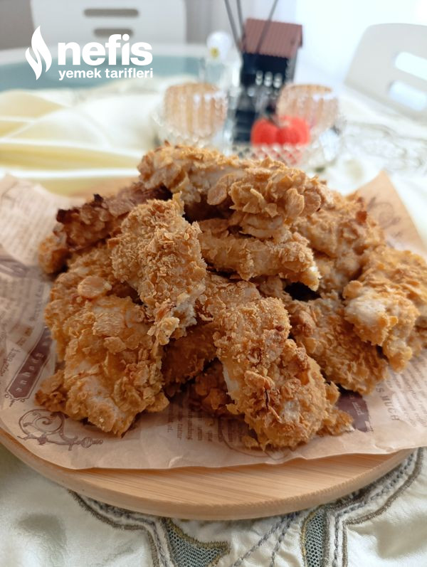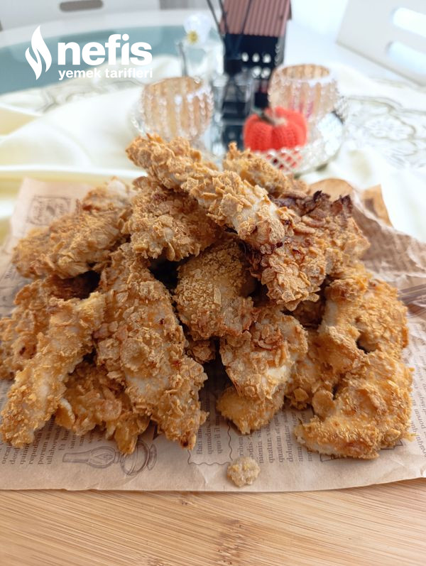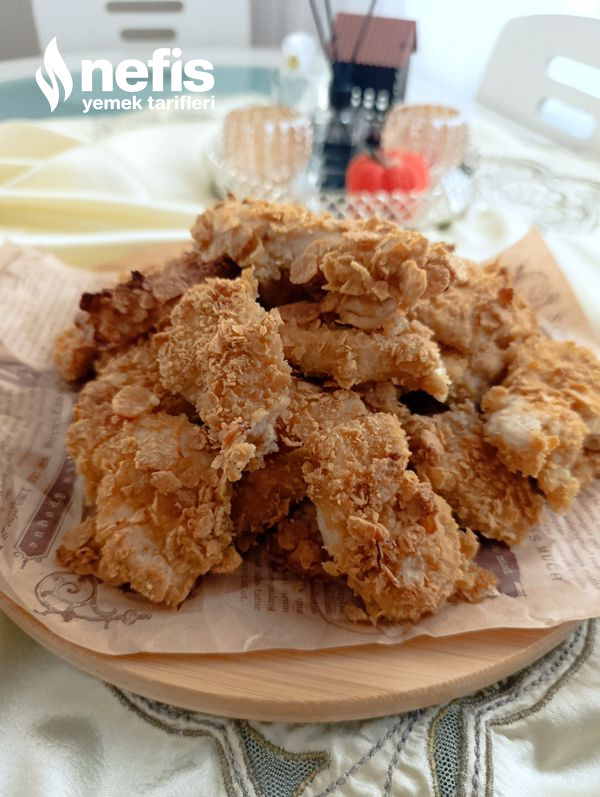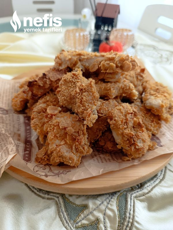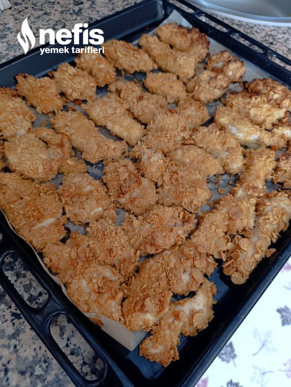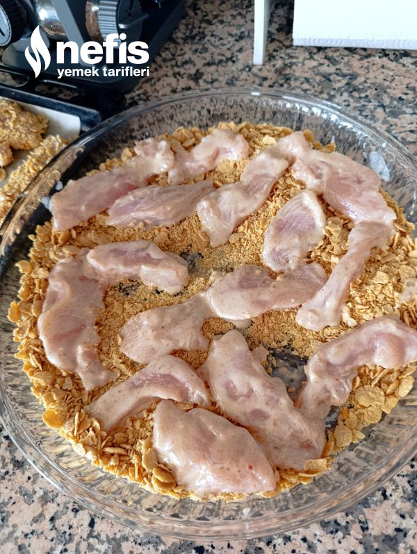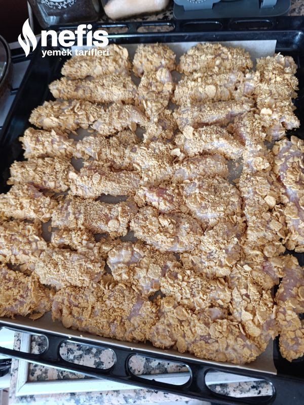 - Mısır gevreğini robottan geçirin yahut eliniz ile küçültün dolaptan aldığımız tavukları mısır gevreğine bulayıp, yağlı kağıt serilmiş fırın tepsisine yerleştiriyoruz hepsine birebir süreci uygulayın üzerlerine sıvı yağ gezdirin.