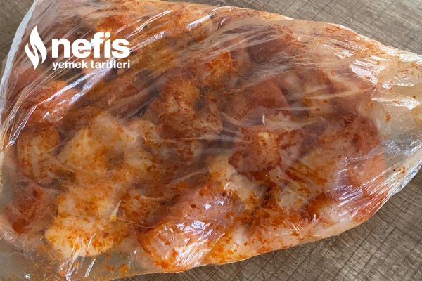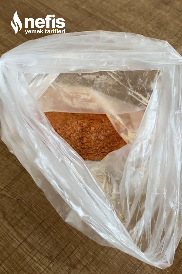 2. Baharatları fırın torbası ya da büyük bir buzdolabı poşetinde karıştırıyoruz, üzerine tavuğu ekleyip tüm tavuğu baharatlayıp geniş bir tabağa alıyoruz.