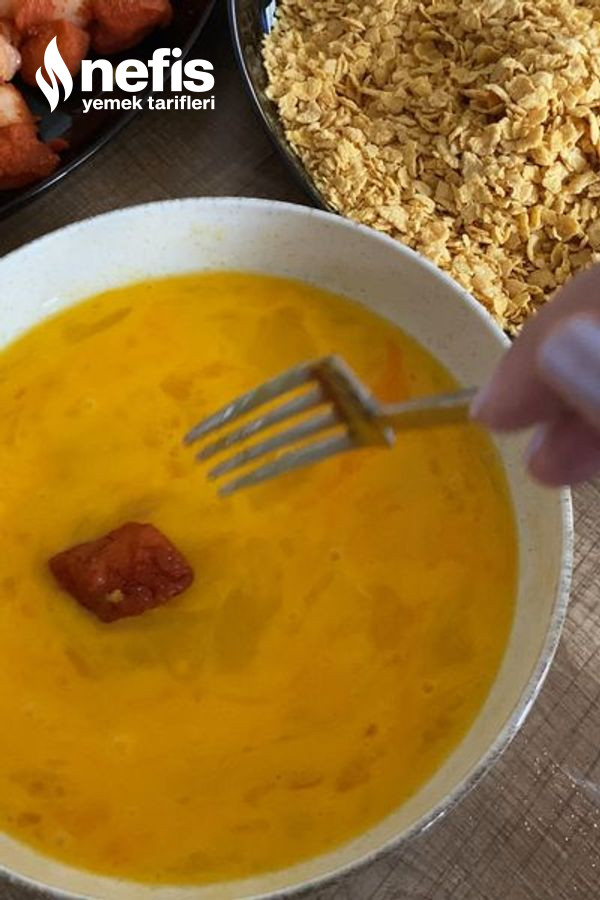 4. Tavuğu evvel yumurta sonra mısır gevreği, sonra tekrar yumurta ve mısır gevreğine batırıyoruz.