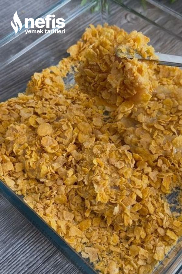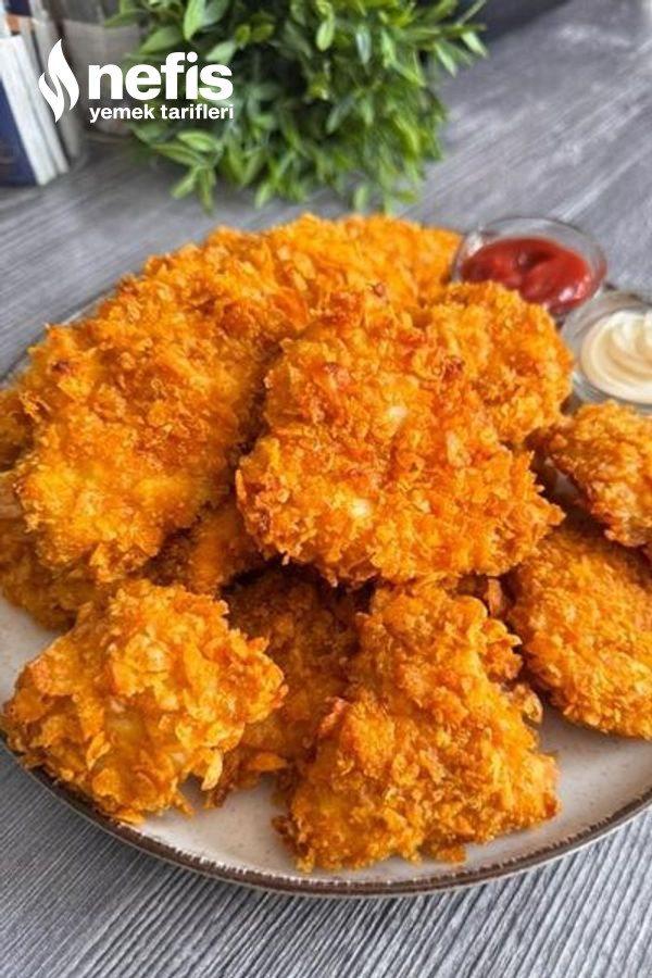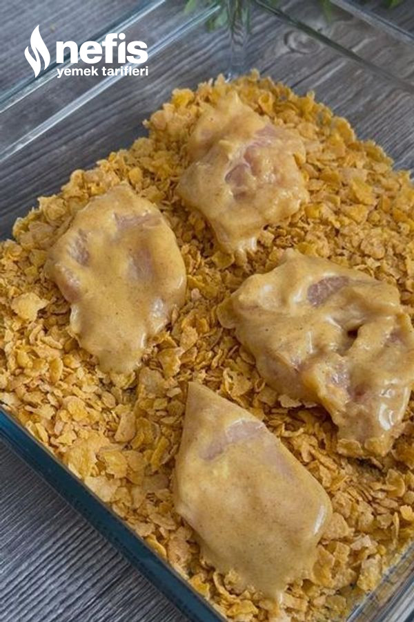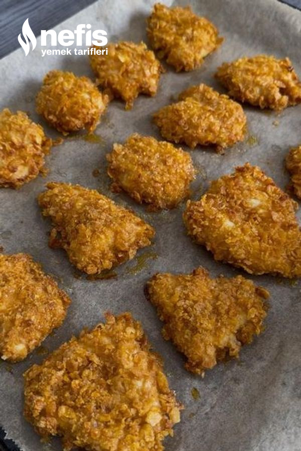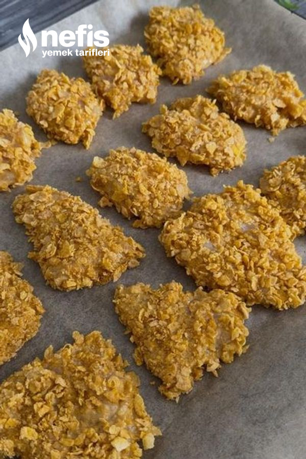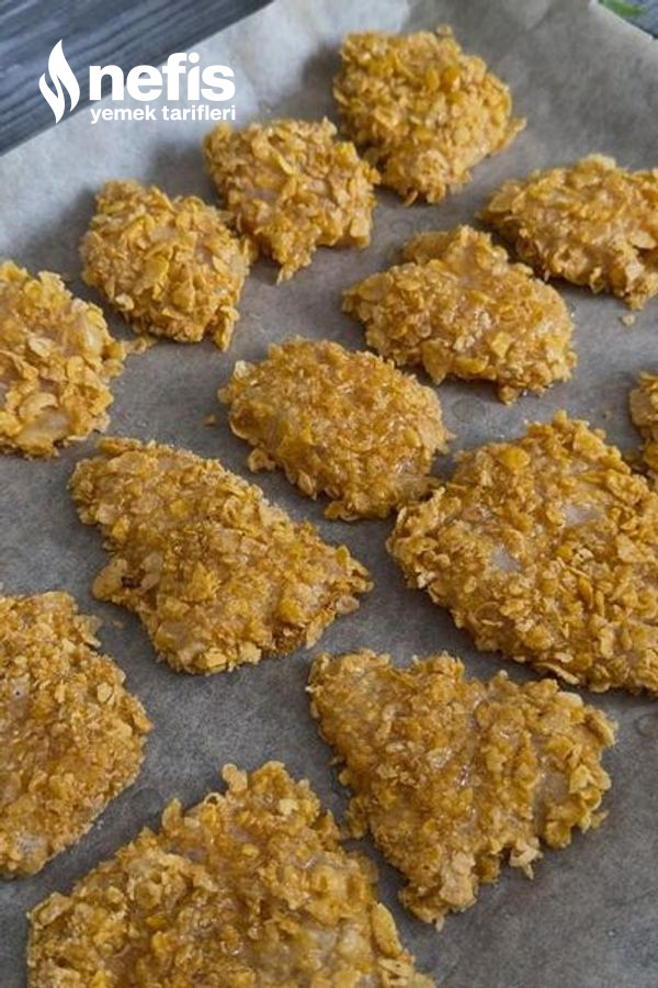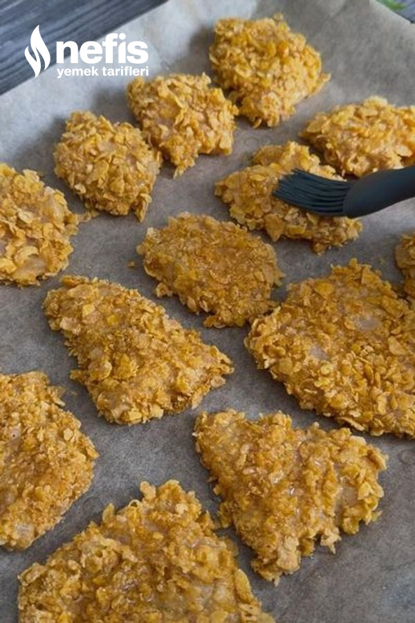 5. Tavukları mısır gevreğine bulayın ve yağlı kağıt serili fırın tepsisine dizelim.