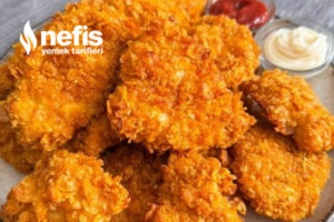 5. Tavukları mısır gevreğine bulayın ve yağlı kağıt serili fırın tepsisine dizelim.