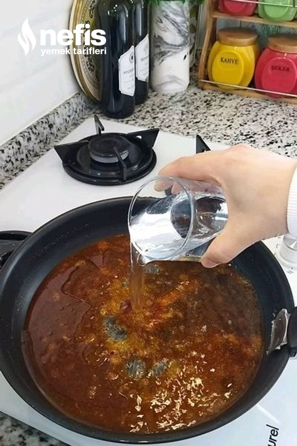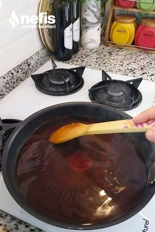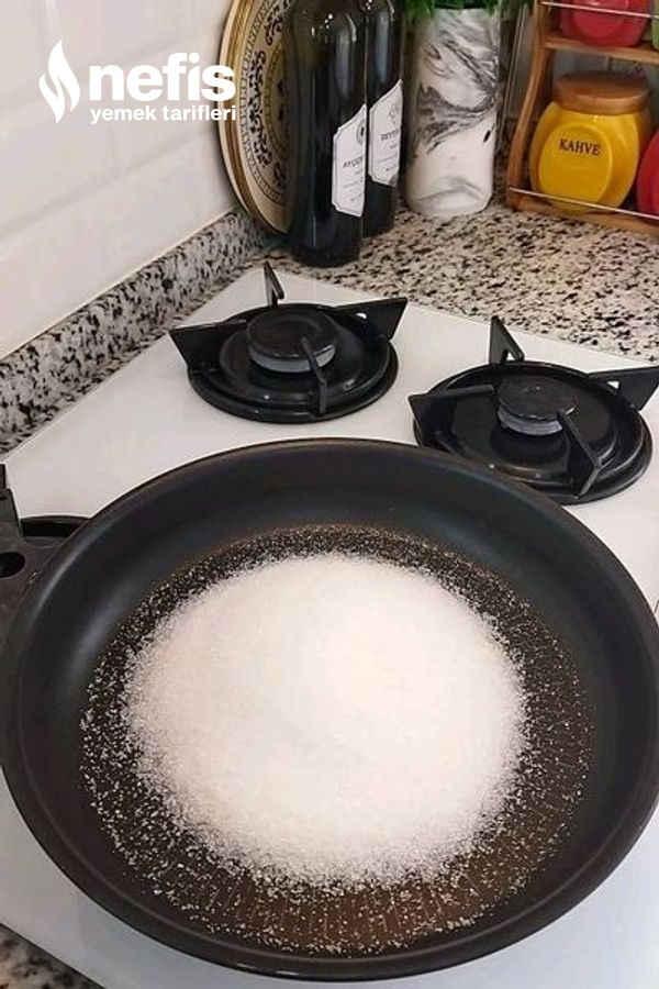 - Geniş bir tavaya şekeri döküp kısık ateşte eritin. (karıştırırken metal kaşık kullanmayın) şeker eriyip karamelize olduktan sonra suyu dökün.
