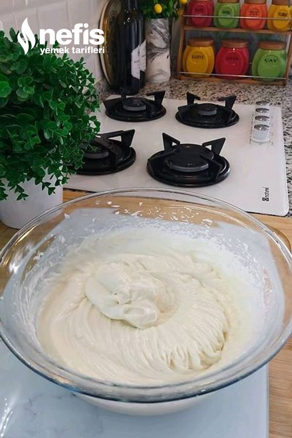 - Ayrı bir kaba aktarıp üzerine değecek biçimde poşet ile kapatın ve büsbütün soğuyana kadar bekleyin. (ben geceden hazırlayıp buzdolabına koydum kıvamı daha uygun oluyor) düzgünce soğuduktan sonra krem şanti ekleyip 5-6 dakika çırpın.