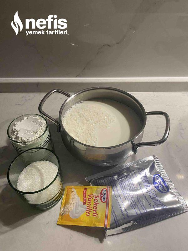 - Tatlının kreması için uygun bir tencereye süt, nişasta, toz şeker ve vanilyayı alalım.